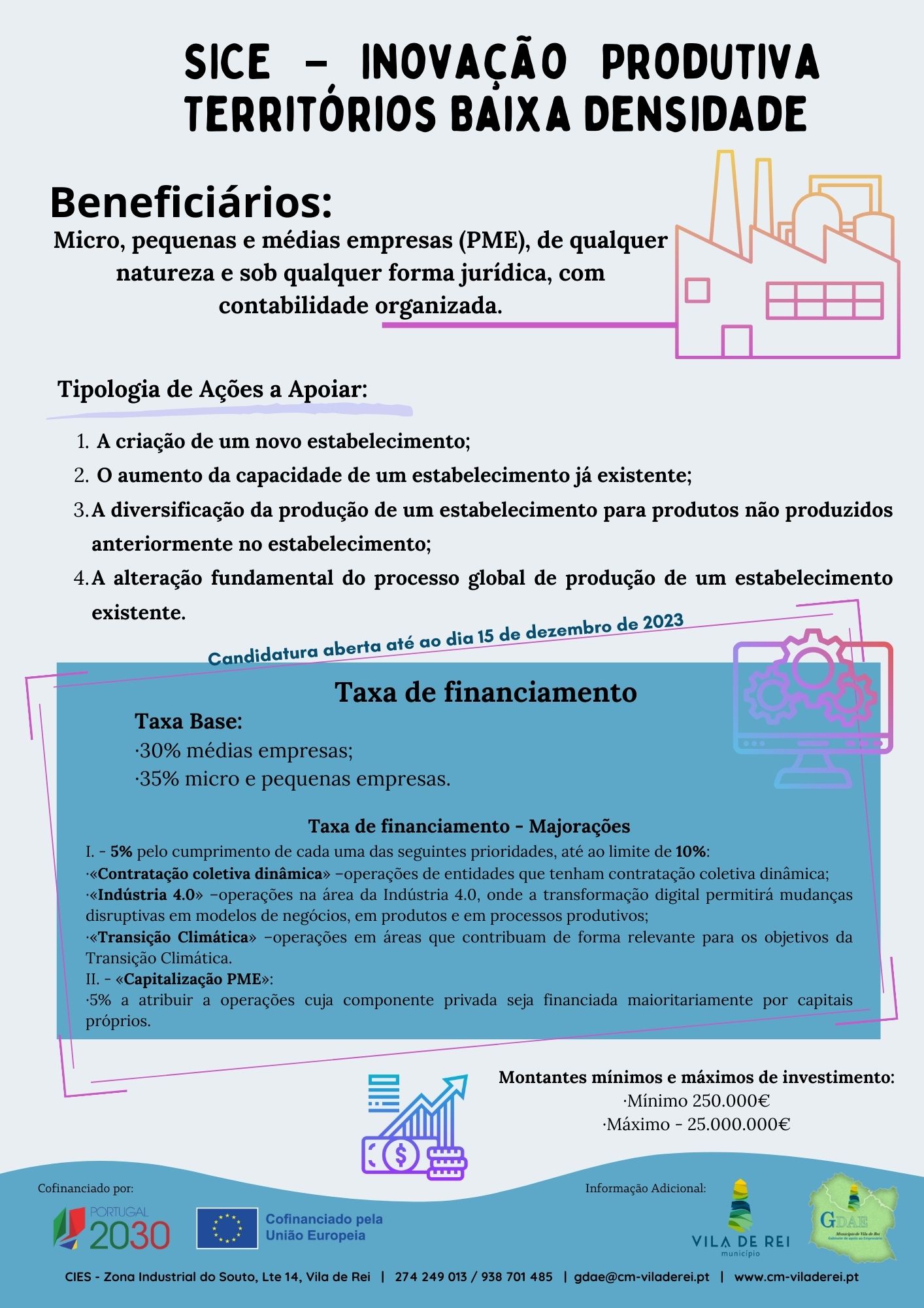 Informa-se que decorre o período de apresentação de candidaturas ao Aviso SICE - MPr/2023/02 - Inovação Produtiva – Territórios Baixa Densidade até ao dia 15 de dezembro de 2023, o qual visa promover a inovação e a competitividade empresarial em regiões de baixa densidade populacional. Este incentivo oferece apoio financeiro e técnico para empresas que queiram desenvolver projetos inovadores e/ou a criação de novos produtos e serviços, particularmente nesta região NUTS II (Centro), de modo a impulsionar o crescimento económico e o emprego.
